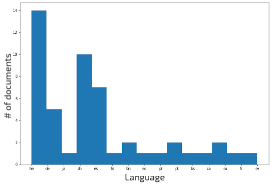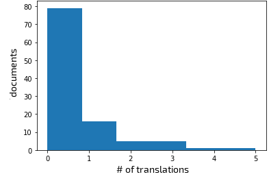 Document selection Table C.2 present the distribution of selected documents from the Flores-101 devtest split based on their domain and the number of sentences that compose them. The first goal in the selection process was to preserve a rough balance between the three categories while including mostly 4 and 5-sentence docs which are faster to edit in PET (no need to frequently close and reopen an editing window). Another objective of the selection was to minimize the chance of translators finding the translated version of the Wikipedia article from which documents were taken and copied from there, despite our guidelines. We thus scrape the articles from Wikipedia and assess the number of available translations. Among the selected documents, only a small subset has translations in other languages (see Figure C.1 top, an article can have multiple languages), mainly in Hebrew (14), Chinese (10), Spanish (7) and German (5) respectively. Considering the total number of translations for every article (Figure C.1 bottom), we see that roughly 75% of them (79 docs) have no translations. We consider this satisfactory as proof there should not be a large amount of possible copying involved, and we follow up on this evaluation by also ensuring that no repeated copy-paste patterns are present in keylogs after the warmup stage.