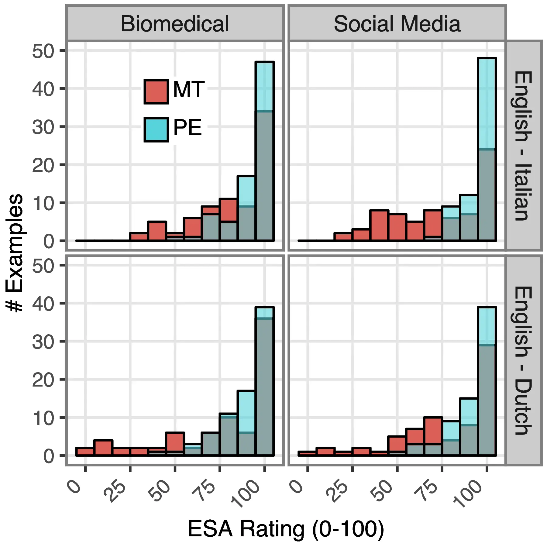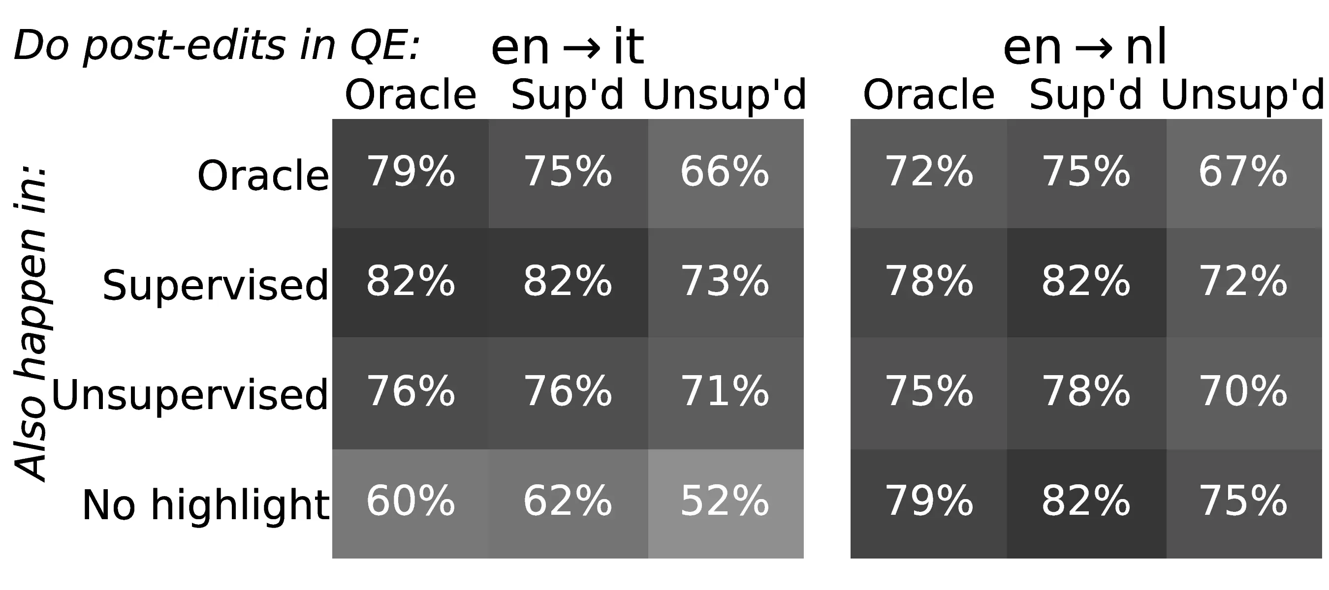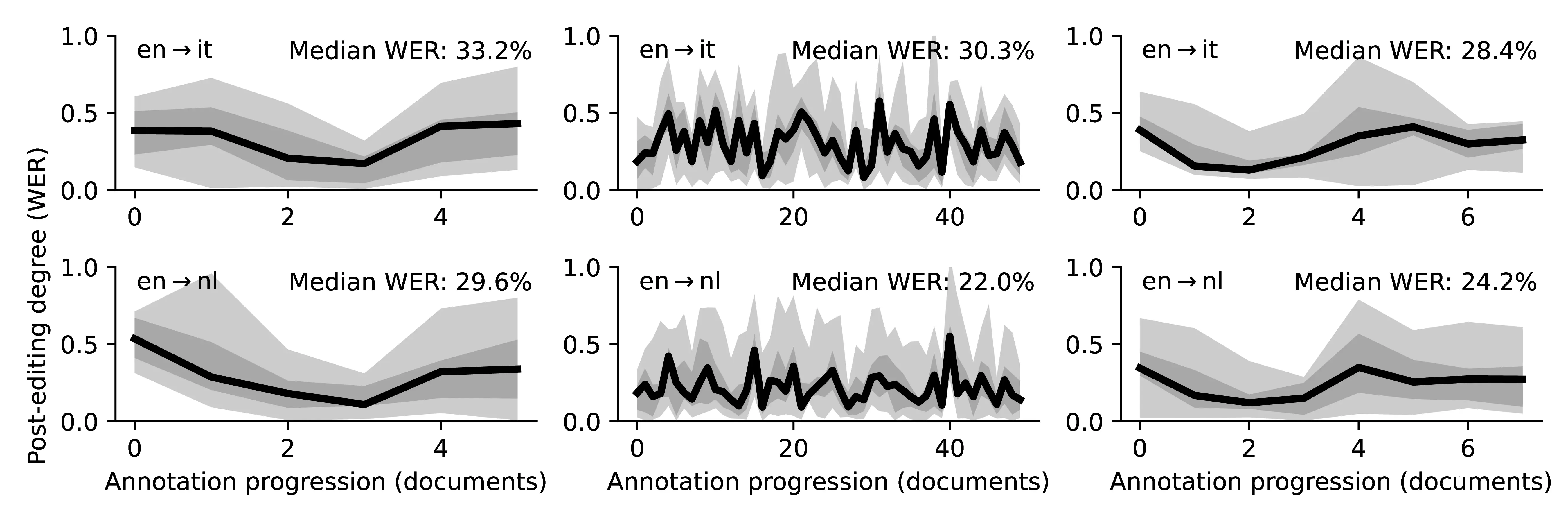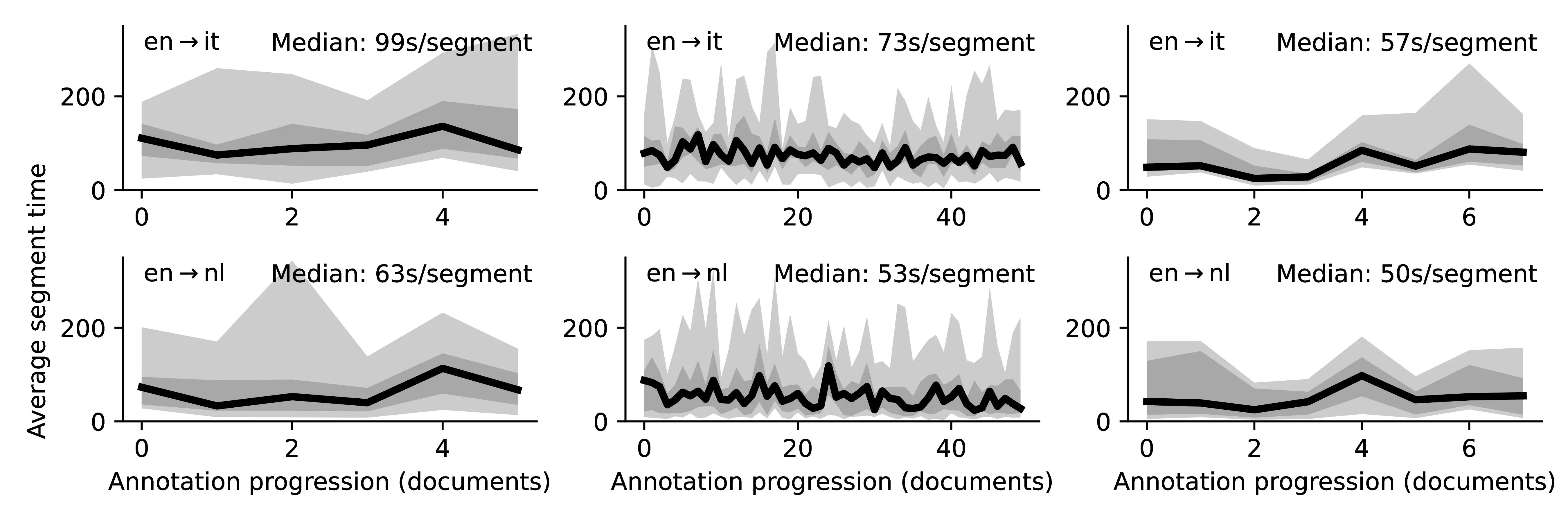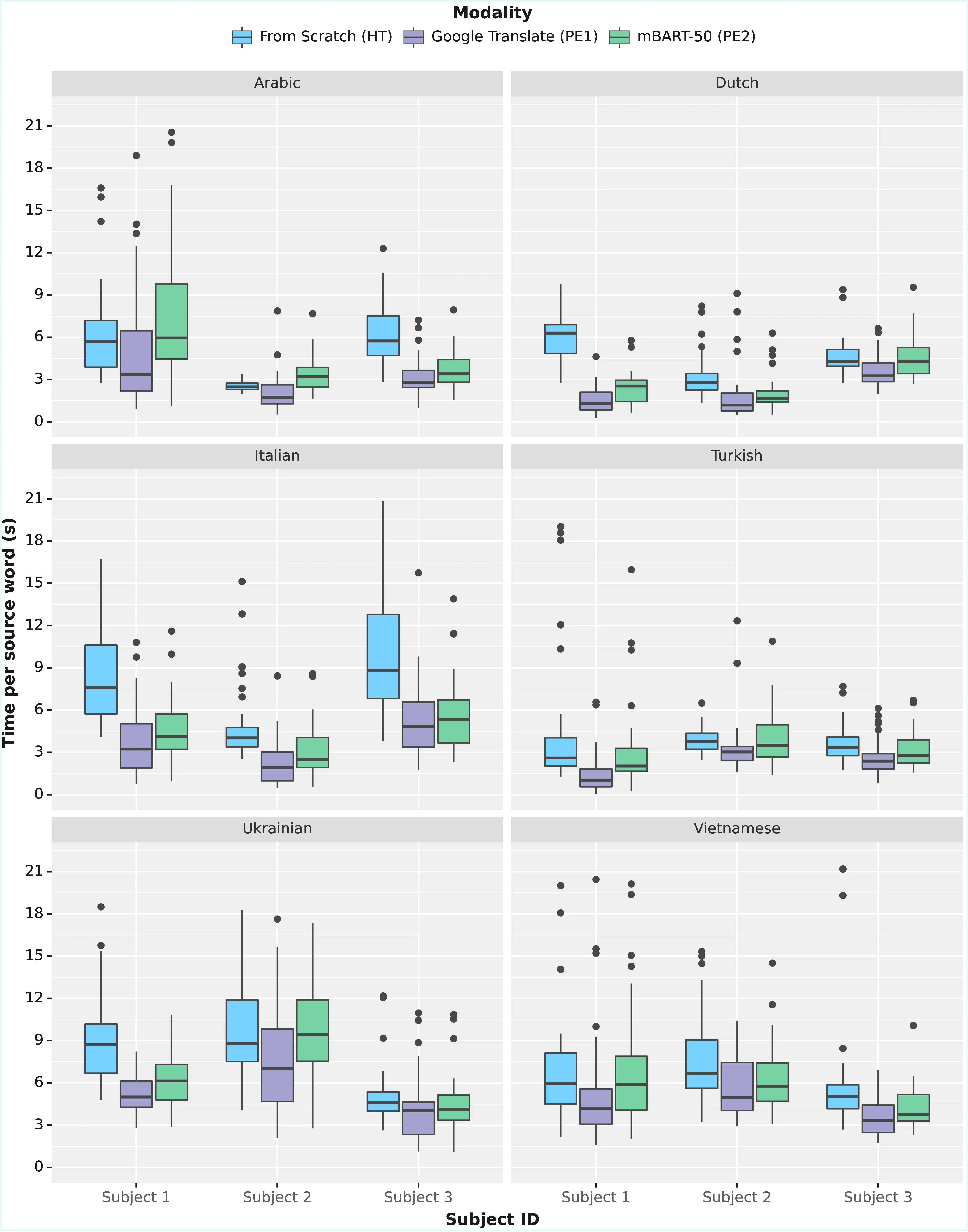 Filtering of Outliers For our analysis of Section 8.4, we only use sentences with an editing time lower than 45 minutes, which was selected heuristically as a reasonably high threshold to allow for extensive searching and thinking. In the following, we present the identifiers of the sentences that were filtered out during this process. E.g. 54.1 means the first sentence of document 54, having item_id equal to flores101-main-541 in the dataset. Note that the sentences were outliers only for 2/6 languages and were all different, indicating no systematic issues in the sample: ARA: 54.1, 100.3, VIE: 3.1, 3.2, 24.3, 28.4, 33.1, 33.2, 40.3, 41.2, 50.3, 100.1, 102.1, 106.1, 107.2, 107.4. The 17 sentences were removed for all modalities and languages in the analysis of Section 8.4 to preserve the validity of our comparison, representing a loss of roughly 4% of the total available data, a tolerable amount for our analysis.