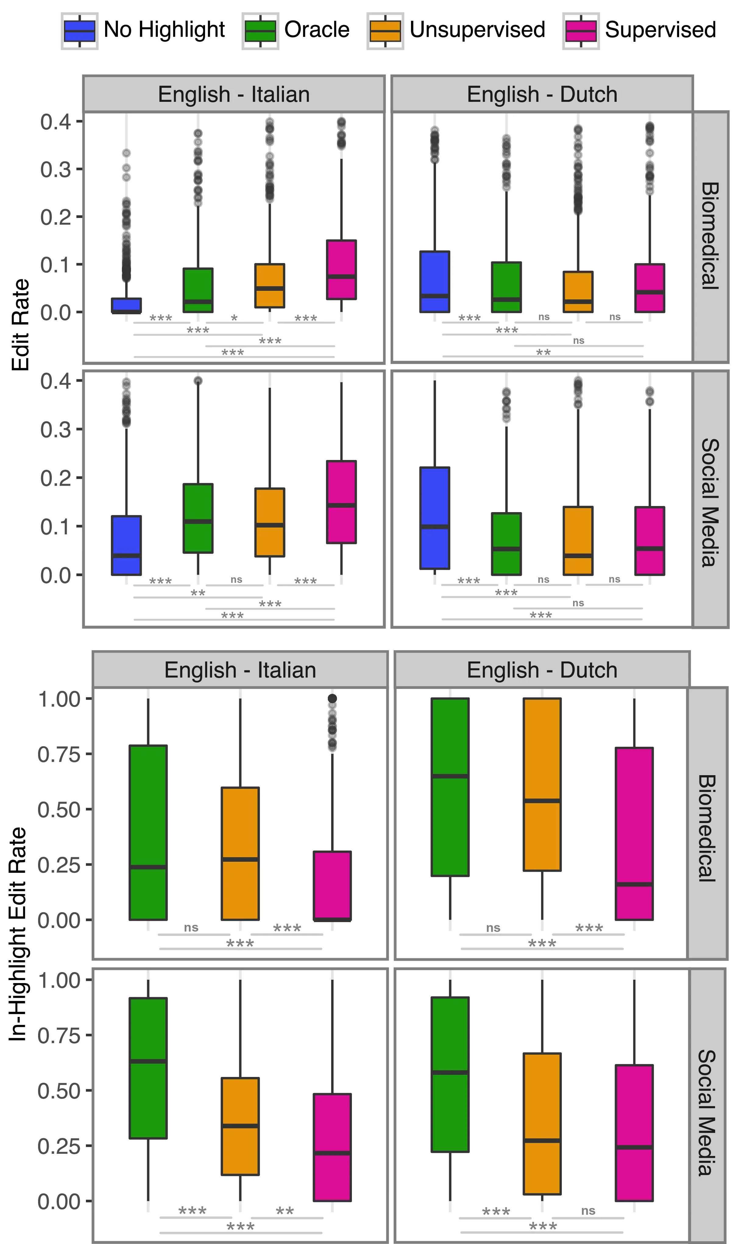 Granular editing metrics and overall HTER computed using the Tercom library. |