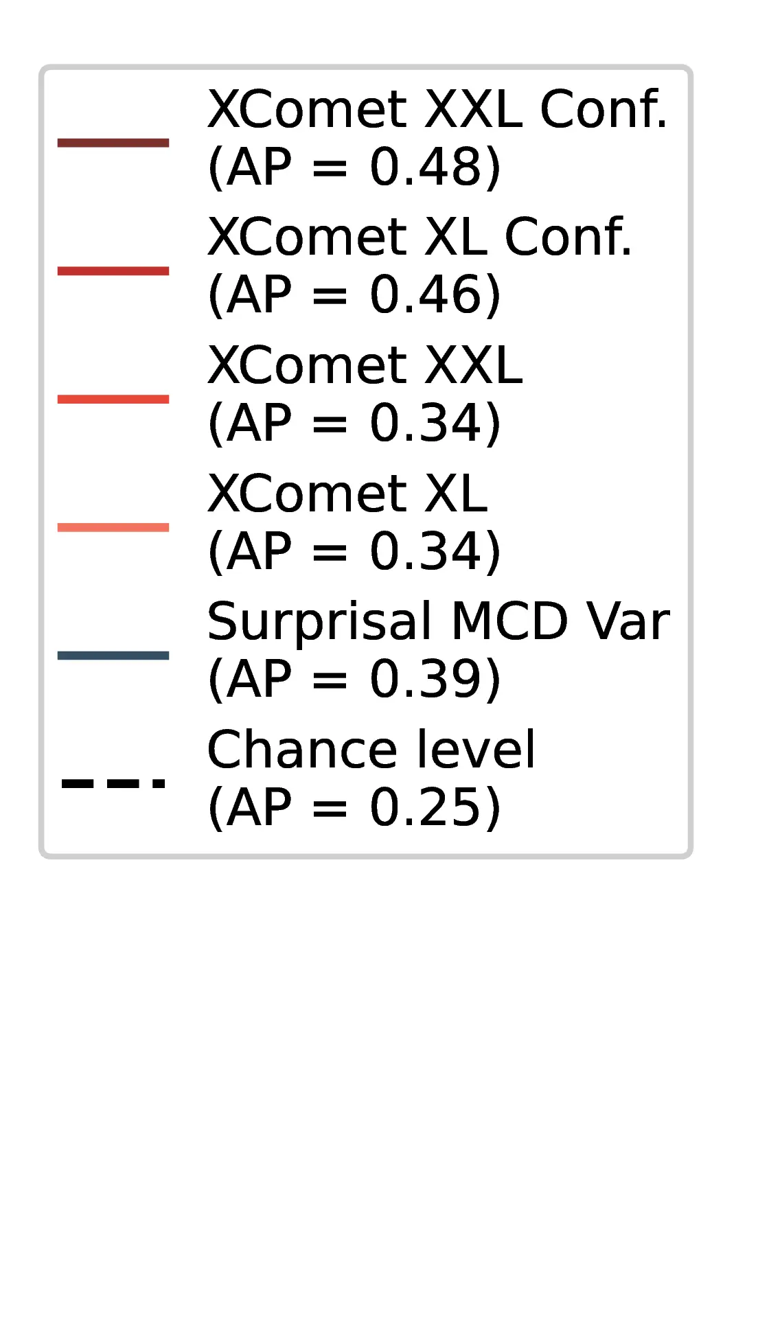 The low recall of these metrics may be problematic in WQE applications, where omitting an error could result in oversights by human post-editors, who may trust the comprehensiveness of WQE predictions. On the contrary, the confidence-weighted xcometconf shows strong performances across the whole recall range, resulting in consistent improvements in both F1* and AP Table 10.4. Concretely, these results confirm that default xcomet performance does not reflect the full capacity of the metric, and operating with granular confidence scores can be beneficial when calibration is possible.