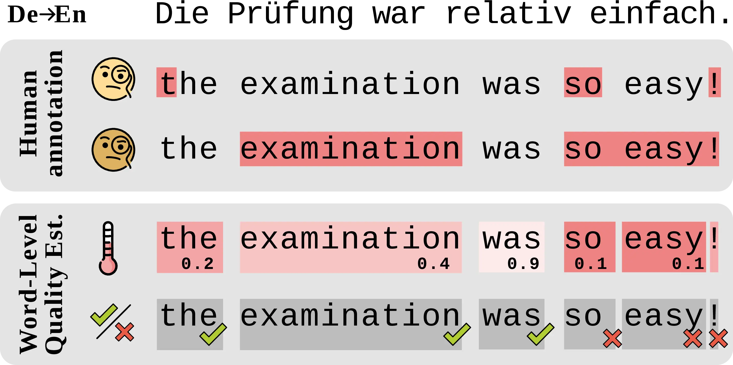 Word-level error spans are widely used in machine translation evaluation to obtain robust and fine-grained estimates of translation quality (Lommel et al., 2013; Freitag et al., 2021a; Freitag et al., 2021b; Kocmi et al., 2024b). Due to the cost of manual annotation, word-level quality estimation (WQE) was proposed for assisting in annotating error spans over MT outputs (Zouhar et al., 2025). Modern WQE approaches generally rely on costly inference with large language models or ad-hoc training with large amounts of human-annotated texts (Fernandes et al., 2023; Kocmi and Federmann, 2023; Guerreiro et al., 2024), making them impractical for less resourced settings (Zouhar et al., 2024).