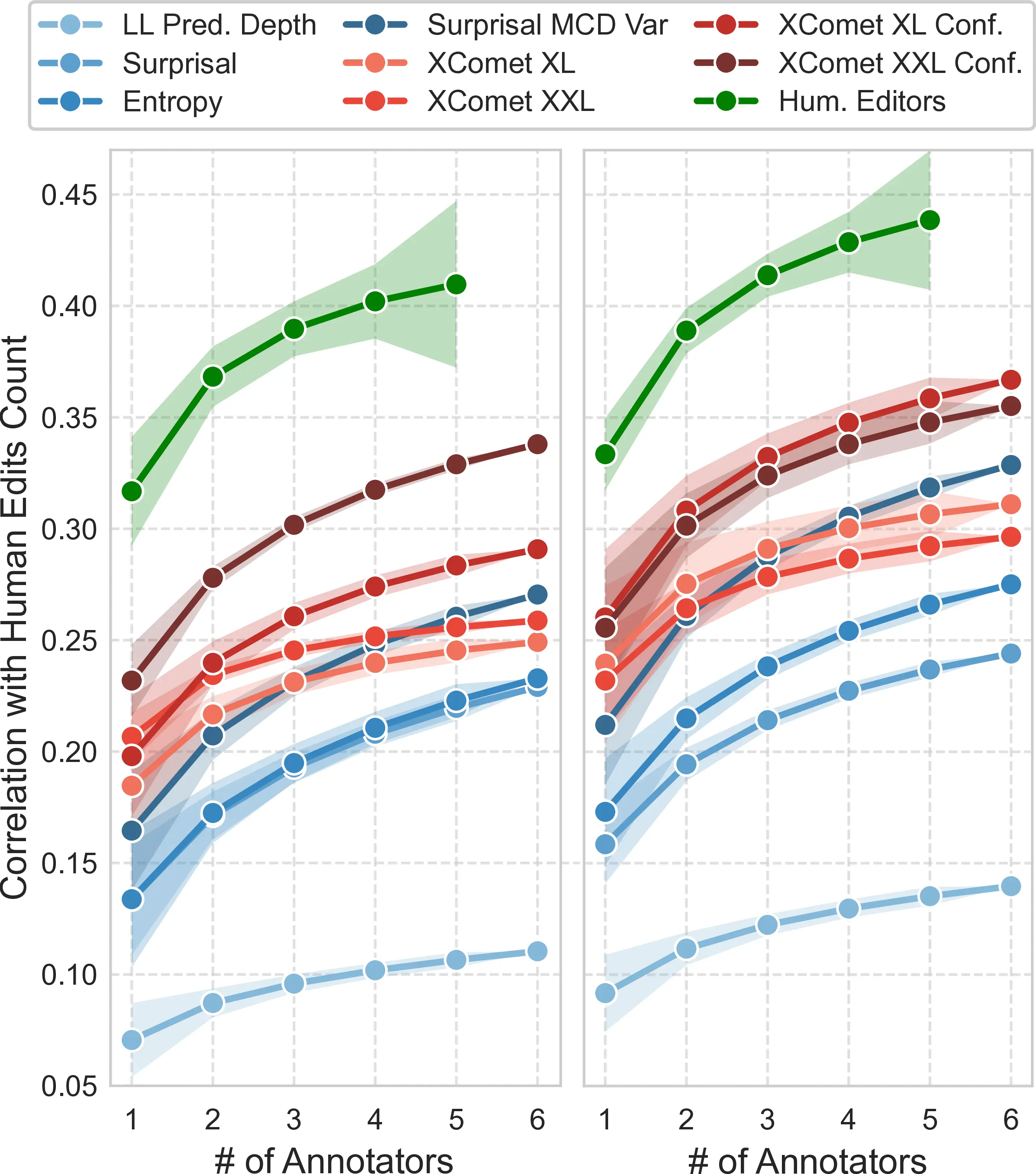 Figure 10.3 presents the correlation of various metrics as the number of annotators available increases, with median values and confidence bounds obtained from edit counts across all combinations of \(L\) label sets.10 The increasing trend in correlations across all reported metrics indicates that these methods effectively reflect the aleatoric uncertainty in error span labels, i.e., the disagreement between various annotators. In particular, the Surprisal MCDvar metric sees a steeper correlation increase than other well-performing metrics, surpassing default xcomet supervised approaches for higher correlation bins. This suggests the epistemic uncertainty derived from noisy model predictions might be a promising way to anticipate the aleatoric uncertainty across human annotators for WQE. We observe that 95% confidence intervals for high-scoring metrics largely overlap when a single set of labels is used, indicating that rankings of metric performance are subject to change depending on the subjective choices of the annotator. While this poses a problem when attempting a robust evaluation of WQE metrics, we remark that including multiple annotations largely mitigates this issue. As a result, we recommend explicitly accounting for human label variation by including multiple error annotations in future WQE evaluations to ensure generalizable findings.