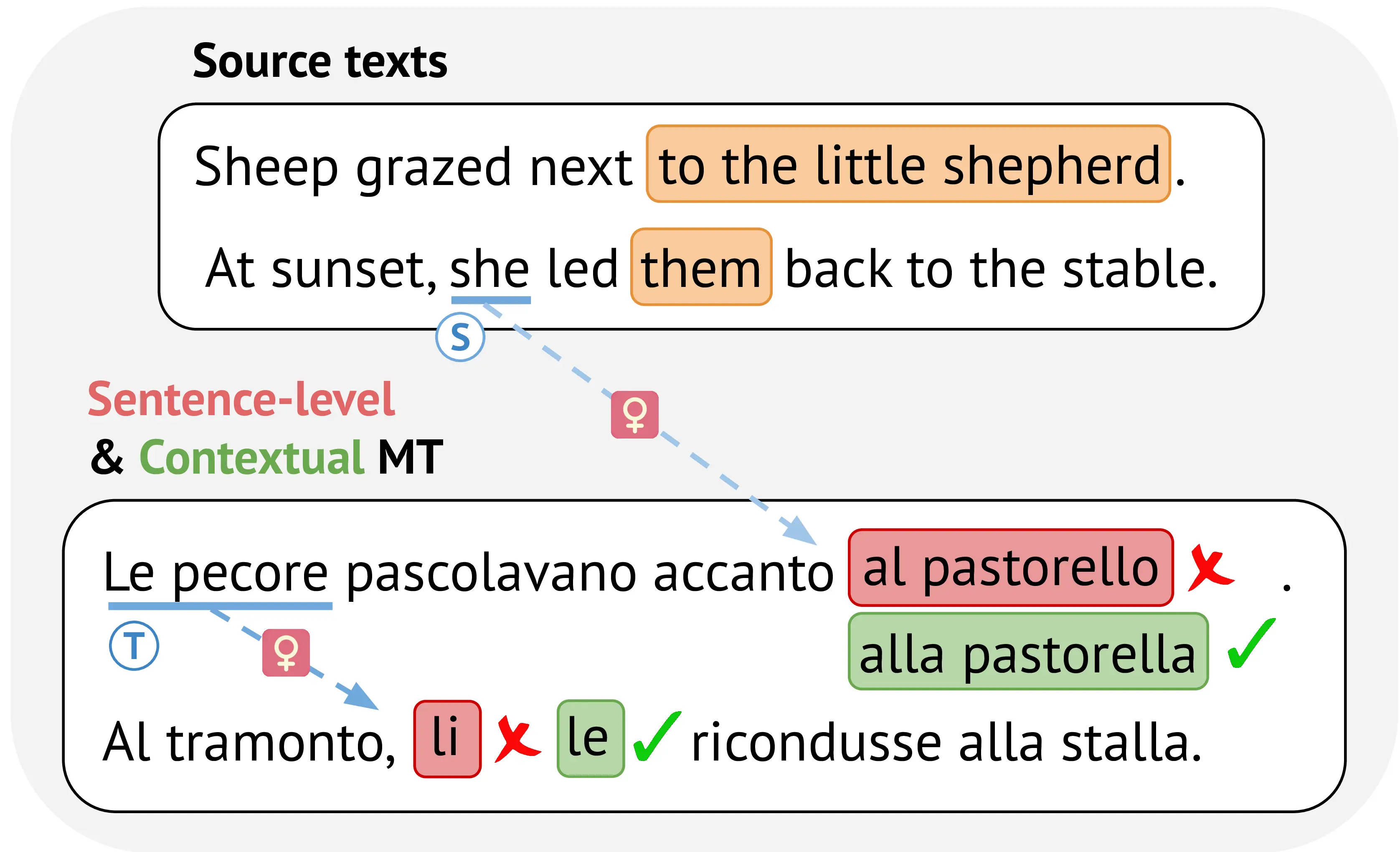 Evaluation Datasets Evaluating generation plausibility requires human annotations for context-sensitive tokens in target sentences and disambiguating cues in their preceding context. To our knowledge, the SCAT dataset (Yin et al., 2021) is the only resource matching these requirements. SCAT is an English\(\rightarrow\)French corpus with human annotations of anaphoric pronouns and disambiguating context on OpenSubtitles2018 dialogue translations (Lison et al., 2018; Lopes et al., 2020). SCAT examples were extracted automatically using lexical heuristics and thus contain only a limited set of anaphoric pronouns (it, they \(\rightarrow\) il/elle, ils/elles), with no guarantees of contextual cues being found in preceding context.