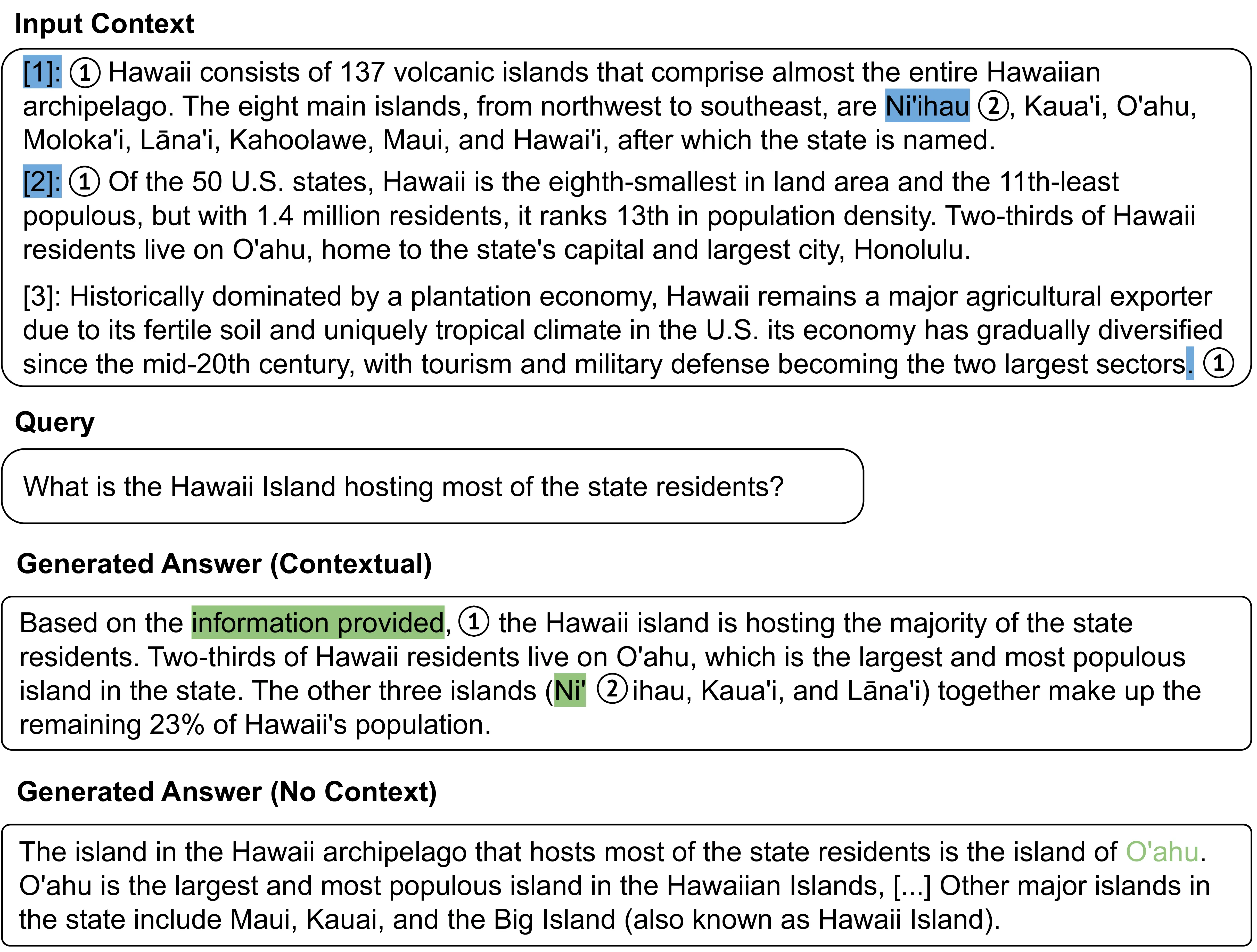 To facilitate the use of PECoRe in future research, a flexible implementation of the framework was incorporated into the Inseq toolkit presented in Chapter 3. Since its v0.6.0 Inseq offers the CLI command attribute-context, supporting all contrastive step functions and attribution methods in the library, and compatible with any decoder-only and encoder-decoder generative language model. Figure 4.5 provides an example employing the Inseq API to attribute a language model answer to input context paragraphs, similarly to the retrieval-augmented generation task we discuss in Chapter 5.8 In the example, the StableLM 2 Zephyr 1.6B language model9 is prompted with contexts retrieved from Wikipedia to provide a long-form answer to a query about population in the Hawaiian islands. When referring to “the information provided” in ⓵, PECoRe identifies the indices of the two documents containing relevant information as salient. The name of Ni’ihau, a small island with barely any population, is also found important when the model produces an additional remark on their population in ⓶. However, we observe that the answer in the context is not identified as salient by PECoRe during generation, suggesting that the model might be relying on memorization. We test the hypothesis by prompting the model in a closed-book setting without context paragraphs, finding that the model can indeed respond correctly without context. Moreover, as expected, the island of Ni’ihau is never mentioned in the contextless response. Additional examples of PECoRe usage for other generation tasks are provided in Section A.2.3.