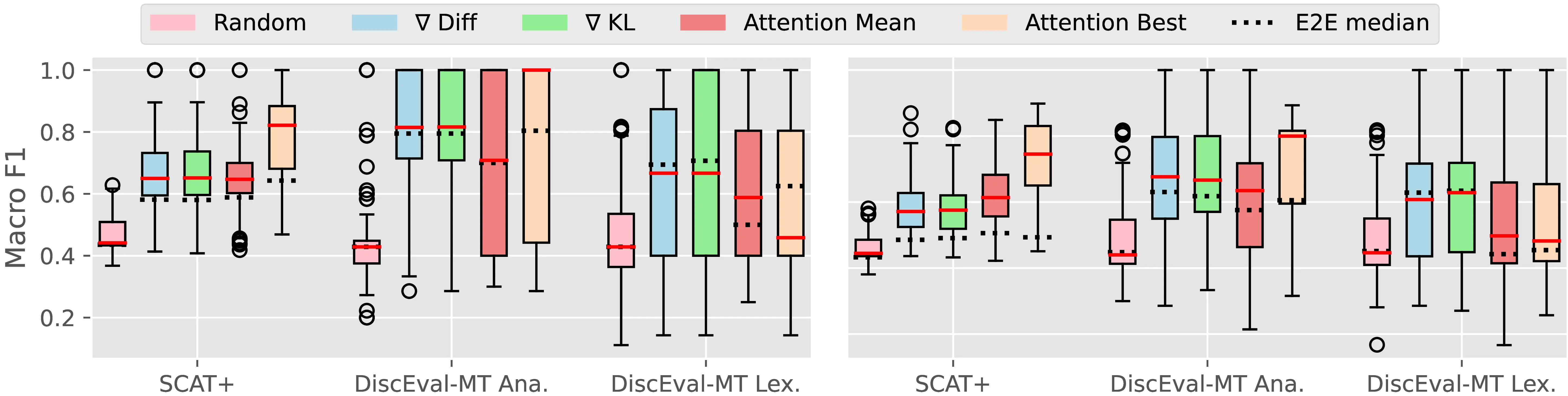 First, contextual cues are more easily detected for the source-only model using all evaluated methods. This finding corroborates previous evidence highlighting how context usage issues might emerge when lengthy context is provided (Fernandes et al., 2021; Shi et al., 2023). When moving from gold CTI tags to the end-to-end setting (E2E) we observe a larger drop in plausibility for the SCAT+ and DiscEval-MT ana datasets that more closely match the fine-tuning data of analyzed MT models. This suggests that standard evaluation practices may overestimate model plausibility for in-domain settings and that our proposed framework can effectively mitigate this issue. Interestingly, the Attention Best method suffers the most from end-to-end CCI application, while other approaches are more mildly affected. This can result from attention heads failing to generalize to other discourse-level phenomena at test time, providing further evidence of the limitations of attention as an explanatory metric (Jain and Wallace, 2019; Bastings and Filippova, 2020). While \(\nabla_\text{diff}\) and \(\nabla_\text{KL}\) appear as the most robust choices across the two datasets, per-example variability remains high across the board, leaving space for improvement for more plausible attribution methods in future work.