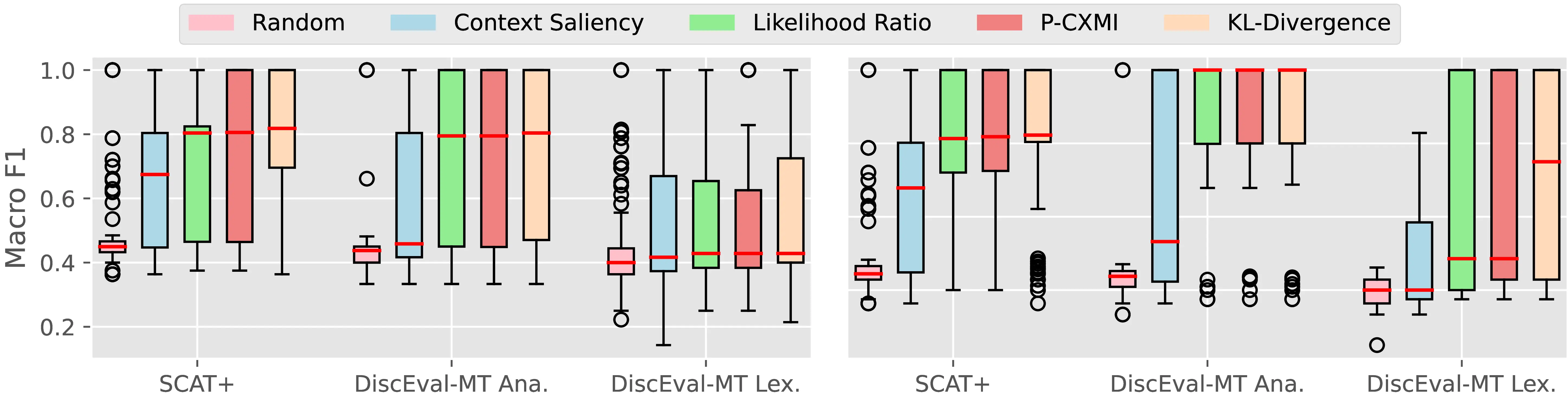 We conduct a controlled CCI evaluation using gold context-sensitive tokens as the starting point to attribute contextual cues. Provided that gold context-sensitive tokens are only available in annotated reference translations, a simple option when applying CCI to those would involve using references as model generations. However, this was shown to be problematic by previous research, as it would induce a distributional discrepancy in model predictions (Vamvas and Sennrich, 2021b). For this reason, we let the model generate a natural translation and instead try to align tags to this new sentence using the awesome aligner (Dou and Neubig, 2021) with labse multilingual embeddings (Feng et al., 2022). While this process is not guaranteed to always result in accurate tags, it provides a good approximation of gold CTI annotations for model generation, which is suitable for our assessment. This corresponds to the baseline plausibility evaluation described in Section 2.2.2, allowing us to evaluate attribution methods in isolation, assuming perfect identification of context-sensitive tokens. Figure 4.4 presents our results. Scores in the right plot are relative to the context-aware Opus Large model of Section 4.4.4 using both source and target context. Instead, the left plot presents results for an alternative version of the same model that was fine-tuned using only the source context (i.e., translating \(C_x, x \rightarrow y\) without producing the target context \(C_y\)). Source-only context was used in previous context-aware MT studies (Fernandes et al., 2022), and we include it in our analysis to assess how the presence of target context impacts model plausibility. We finally validate the end-to-end plausibility of PECoRe-detected pairs using context-sensitive tokens identified by the best CTI metric from Section 4.4.4 (KL-Divergence) as the starting point for CCI, and using a simple statistical selector equivalent to the one used for CTI evaluation.