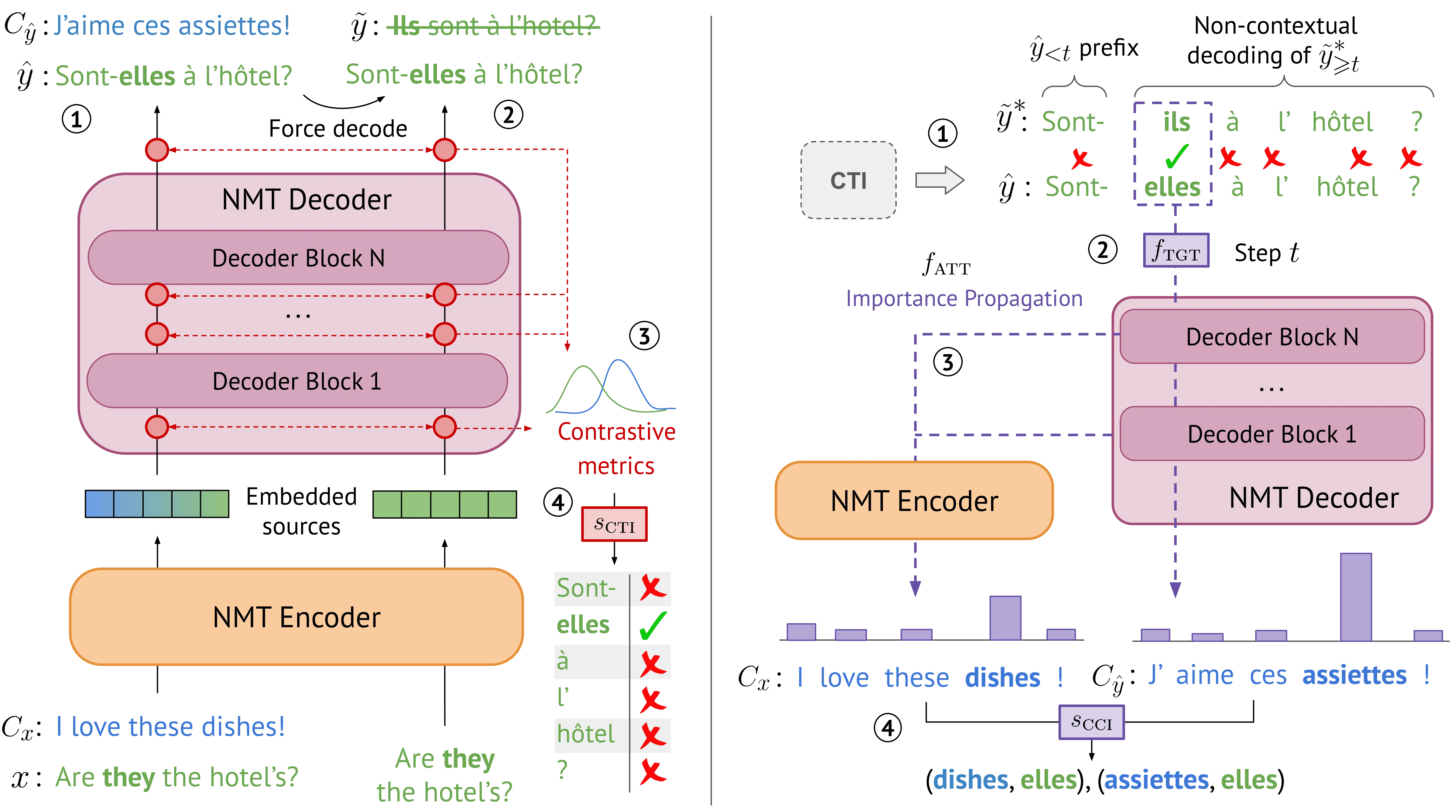CTI adapts the contrastive conditioning paradigm proposed by Vamvas and Sennrich (2021a) to detect input context influence on model predictions using the contrastive pair \(P_\text{ctx}^{i}, P_\text{no-ctx}^{i}\). Both distributions are relative to the contextual target sentence \(\hat y = \{\hat y_1 \dots \hat y_n\}\), corresponding to the sequence produced by a decoding strategy of choice in the presence of input context. In Figure 4.2, the contextual target sentence \(\hat y=\) “Sont-elles à l’hôtel?” is generated when \(x\) and contexts \(C_x, C_{\hat y}\) are provided as inputs, while non-contextual target sentence \(\tilde y =\) “Ils sont à l’hôtel?” would be produced when only \(x\) is provided. In the latter case, \(\hat y\) is instead force-decoded from the non-contextual setting to enable a direct comparison of matching outputs. We define a set of contrastive metrics \(\mathcal{M} = \{m_1, \dots, m_M\}\), where each \(m: \displaystyle \Delta_{|\mathcal{V}|} \times \Delta_{|\mathcal{V}|} \mapsto \mathbb{R}\) maps a contrastive pair of probability vectors to a continuous score. For example, the difference in next token probabilities for contextual and non-contextual settings, i.e. \(P_\text{diff}(\hat y_i) = P_\text{ctx}(\hat y_i) - P_\text{no-ctx}(\hat y_i)\), might be used for this purpose.4 Target tokens with high contrastive metric scores can be identified as context-sensitive, provided \(C\) is the only added parameter in the contextual setting. Finally, a selector function \(s_\text{cti}: \displaystyle \mathbb{R}^{| \mathcal{M} |} \mapsto \{0,1\}\) (e.g. a statistical threshold selecting salient scores) is used to classify every \(\hat y_i\) as context-sensitive or not.