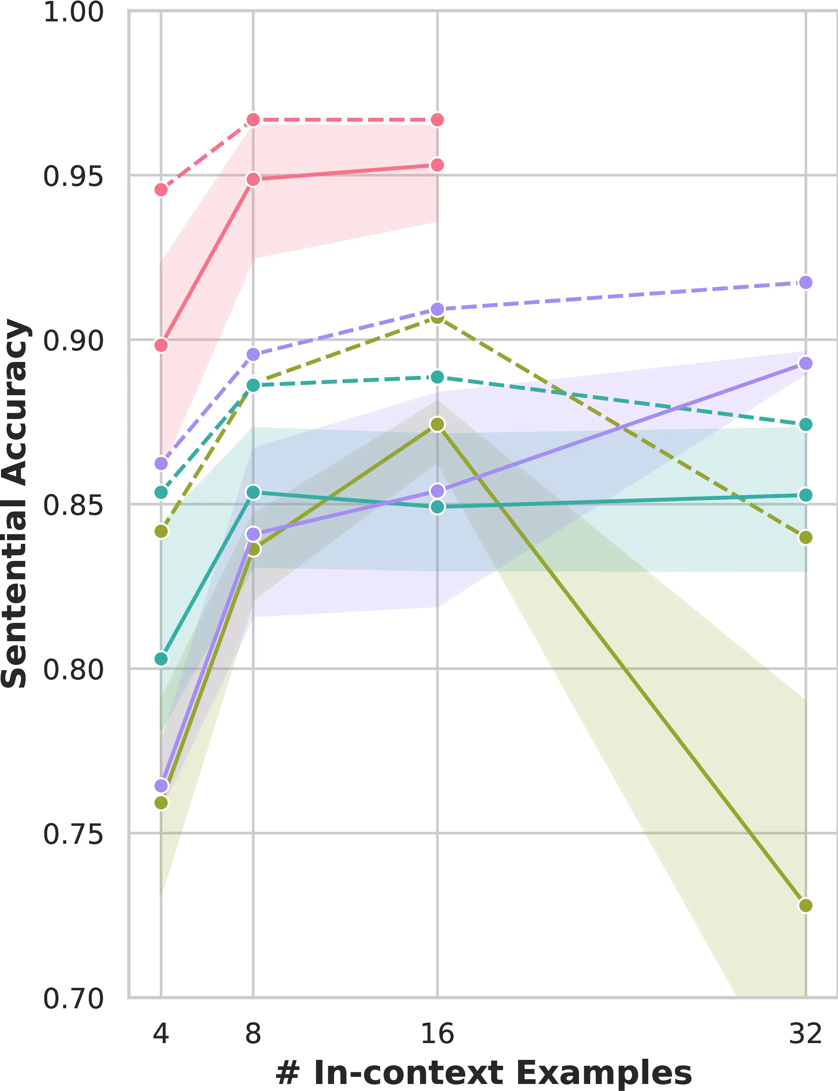 We begin by conducting a preliminary evaluation of 3 LLMs across different ranges of in-context examples to reduce the number of experimental settings for our main assessment. We perform formality-controlled translation using CoCoA-MT, and evaluate LLMs by varying the number of in-context examples (i.e., 4-8-16-32, selected based on the feasible context length6). Figure 6.2 presents results averaged across all four languages seen by Bloom during its pre-training.