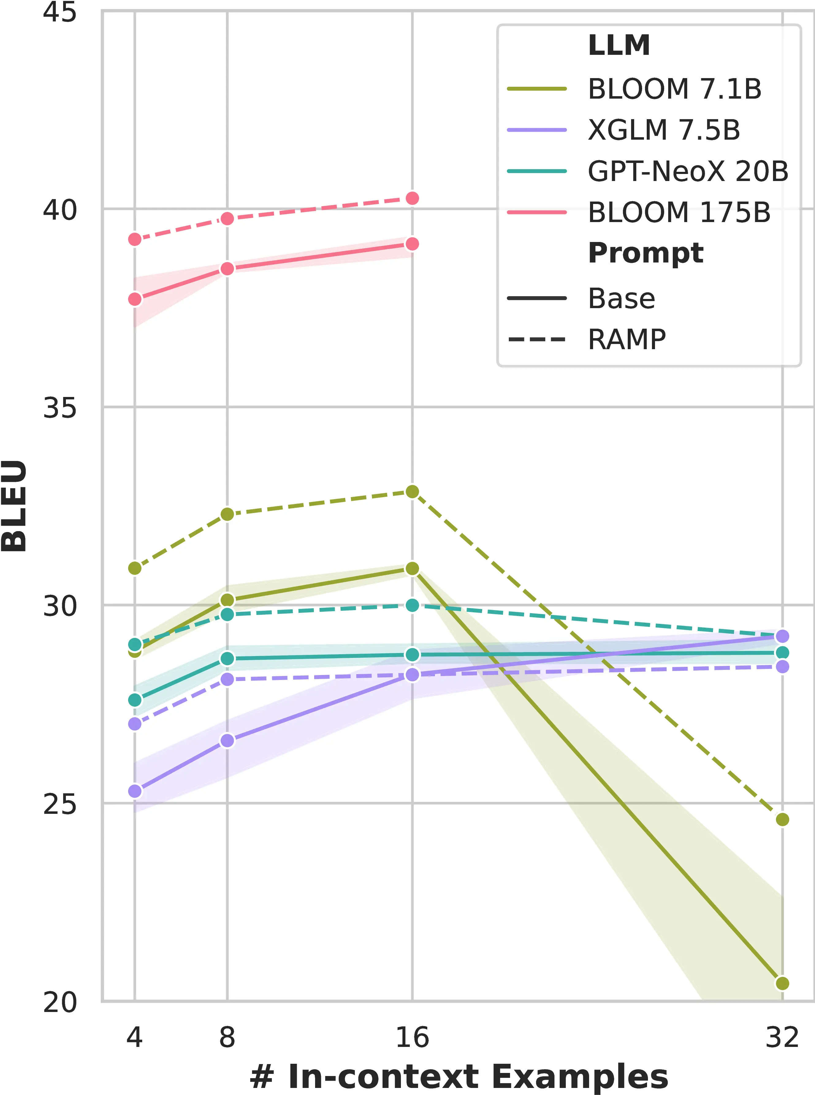 We observe that Ramp generally outperforms base prompting (i.e., random in-context examples and no attribute marking) across most LLMs and example settings for both BLEU and formality accuracy. Moreover, BLEU and formality accuracy improve with increased model size and with the number of examples, until this number reaches 16. Based on these results, we move forward with the main evaluation using XGLM 7.5B and Bloom 175B models and 16 in-context examples for both datasets.