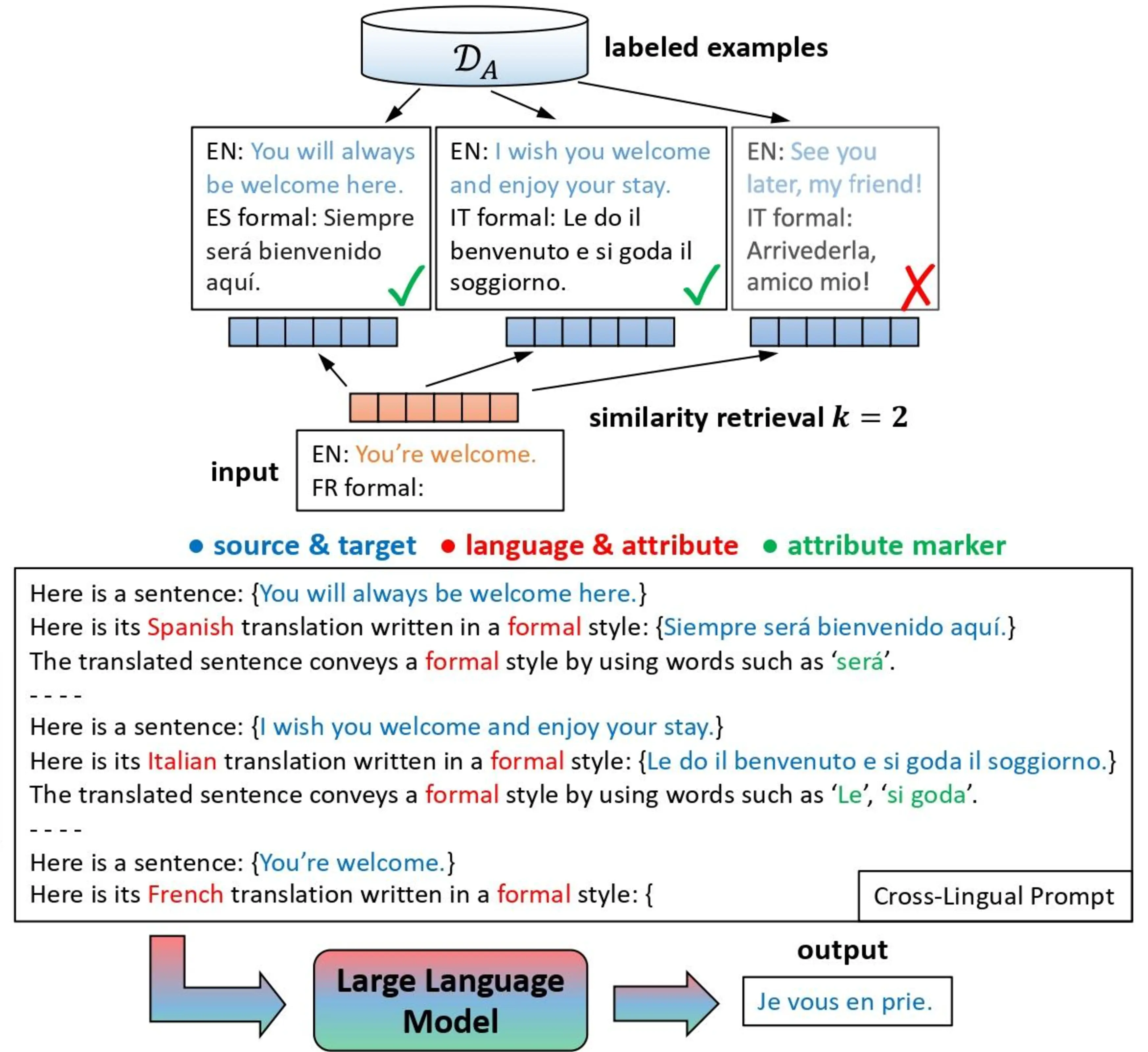 The similarity retrieval component of Ramp requires a large pool \(\mathcal{D}_A\) from which to find appropriate in-context examples for prompting. Low-resource attributes or language pairs may have insufficient or no annotated data from which to retrieve such examples. To mitigate this issue, we introduce cross-lingual prompting, in which the target side of the in-context examples differs from the desired target language of the translation task. As demonstrated in Figure 6.1, we investigate whether the system can leverage examples in one language (e.g., attribute indicators in Spanish) to produce the same attribute in another (e.g., French). Two main features of our Ramp model allow us to perform cross-lingual prompting: (1) the use of multilingual LLMs, and (2) the example retrieval step, which is done on the source language only.